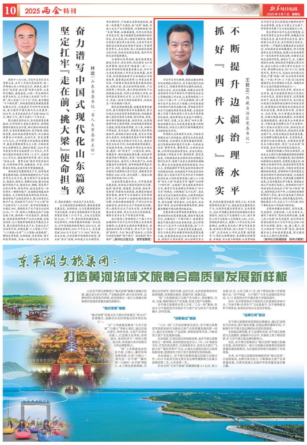 完整準確全面貫徹新發(fā)展理念,扎實推動經(jīng)濟社會高質(zhì)量發(fā)展。推進中國式現(xiàn)代化,邊疆地區(qū)一個都不能少。高質(zhì)量發(fā)展是中國式現(xiàn)代化的首要任務。我們牢固樹立以人民為中心的發(fā)展思想,把“三個賦予一個有利于”總要求貫穿發(fā)展始終,堅定不移走符合西藏實際的高質(zhì)量發(fā)展之路,統(tǒng)籌推進深層次改革和高水平開放,持續(xù)擴大有效投資,加大招商引資力度,加快發(fā)展清潔能源、綠色工業(yè)、文化旅游等特色優(yōu)勢產(chǎn)業(yè),因地制宜發(fā)展新質(zhì)生產(chǎn)力,讓經(jīng)濟發(fā)展當前有活力、未來有潛力。2024年西藏主要經(jīng)濟指標增速位居全國前列,地區(qū)生產(chǎn)總值增長6.3%,城鄉(xiāng)居民人均可支配收入分別增長6.8%、8.3%。堅持把改善民生、凝聚人心作為出發(fā)點和落腳點,把群眾身邊的小事當作各級黨委、政府的大事來抓,深入實施“十大民生工程”,扎實辦好21件民生實事,穩(wěn)步提升13項民生保障指標,各族群眾的獲得感、幸福感、安全感不斷增強。認真貫徹落實習近平總書記重要指示精神和黨中央決策部署,在各方力量大力支持下,科學有序開展了定日縣抗震救災工作。