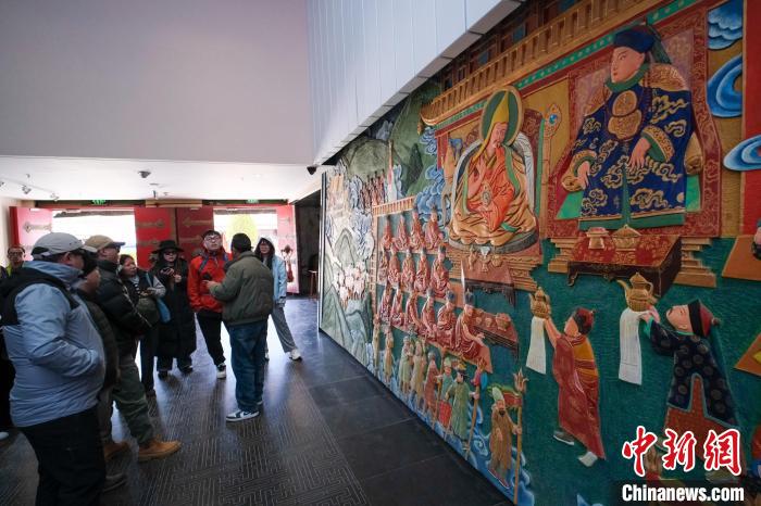 3月18日,游客在布達拉宮珍寶館參觀五世達賴喇嘛到北京覲見順治皇帝的浮雕。中新社記者 江飛波 攝