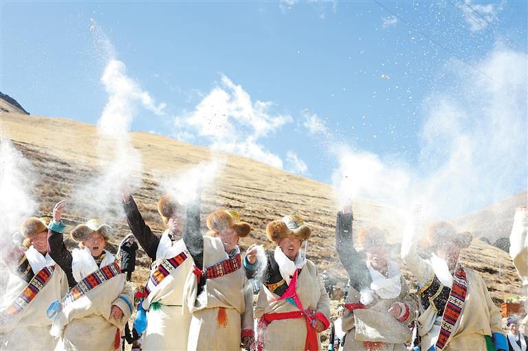 山南市瓊結(jié)縣拉玉鄉(xiāng)村民拋撒糌粑。通訊員 米瑪央金 倫珠澤仁 攝