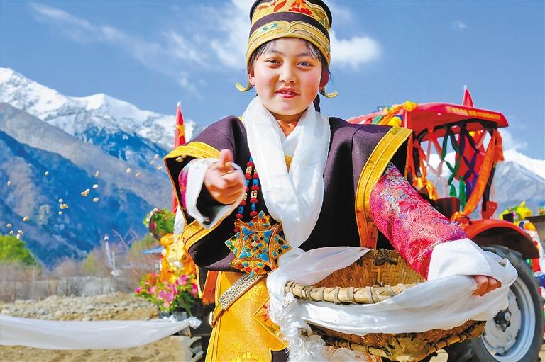 林芝市工布江達(dá)縣工布江達(dá)鎮(zhèn)阿沛村春耕春播儀式上,被推選為“播種者”的次旦拉姆身著盛裝,撒下青稞種子。記者 謝筱純 攝