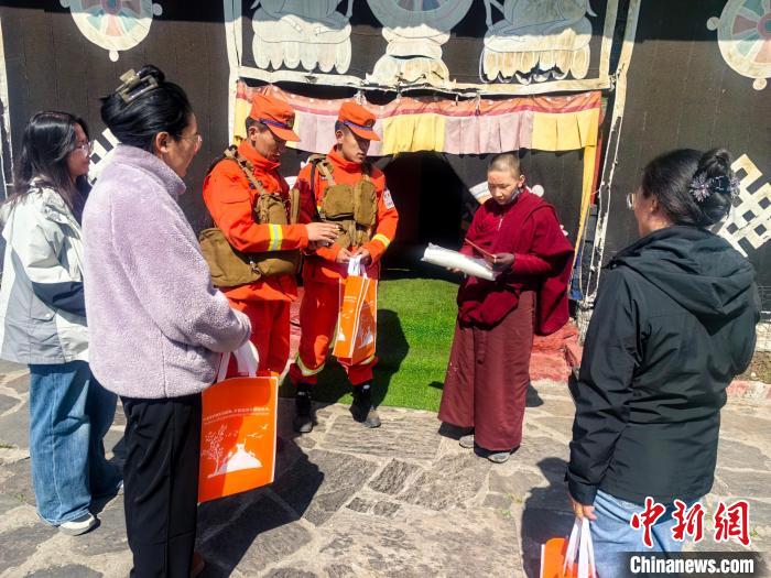 圖為西藏森林消防總隊(duì)隊(duì)員進(jìn)寺廟發(fā)放防火宣傳手冊(cè)。王治平 攝