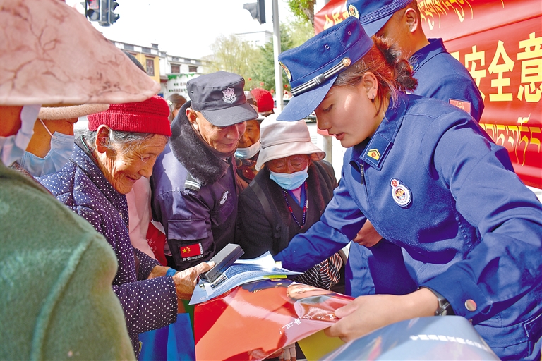 4月15日,山南市瓊結(jié)縣組織開展第十個(gè)全民國(guó)家安全教育日系列宣傳活動(dòng)。圖為瓊結(jié)縣消防救援大隊(duì)工作人員向群眾發(fā)放宣傳資料。記者 孫開遠(yuǎn) 攝