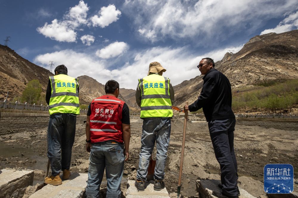 尼瑪(右一)與防汛工作人員一起巡查村中水道(4月24日攝)。