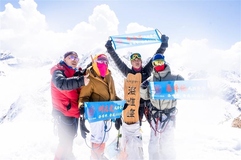當部分山友抵達洛堆峰一處近60度坡度冰面時,太陽緩緩升起,金色的陽光照射在山友們身上,寒冷、缺氧時刻考驗著每一個人,但大家邁著堅定的步伐繼續(xù)攀登。經(jīng)過數(shù)小時的攀登,來自西藏民族大學(xué)體育學(xué)院的3名學(xué)生,最先沖頂成功。隨后,陸續(xù)有山友安全挺進洛堆峰海拔6010紀念碑處。大家共同見證了雪山之巔的壯麗風(fēng)景。