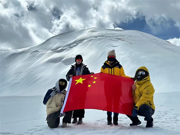 鄒師思告訴記者:“登山過程中,我們團隊展現(xiàn)了高度的專業(yè)性與協(xié)作力。學(xué)院領(lǐng)導(dǎo)提前提供物資與精神支持,專業(yè)教練指導(dǎo)徒步與技術(shù)訓(xùn)練。在海拔5500—6000米段,隊伍統(tǒng)一行軍節(jié)奏,避免體溫流失或體力透支;登頂時,訓(xùn)練突出者率先觸頂,為體力較弱者提供鼓勵與幫助?!彼锌骸皥F隊協(xié)作是登頂?shù)年P(guān)鍵,真正的勇氣源于科學(xué)準備與戰(zhàn)略堅持。”