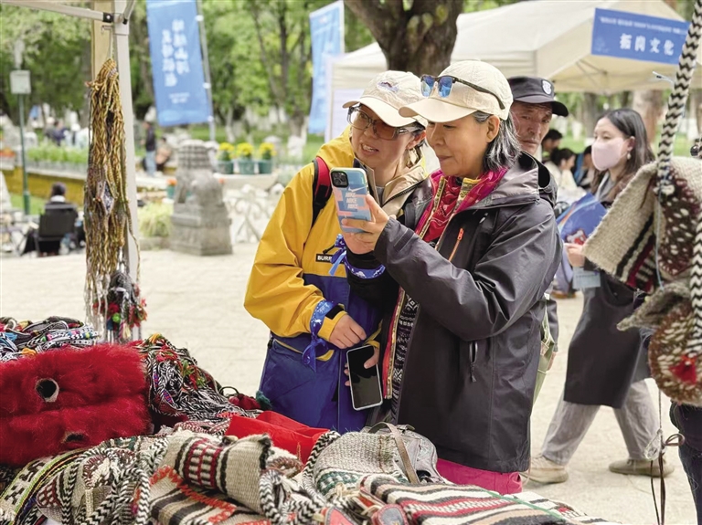 在西藏“非遺”文化體驗(yàn)區(qū),來(lái)自湖南的游客張麗一邊挑選包包一邊感嘆:“哇噻,真的太神奇了!沒(méi)想到牦牛毛還可以做成這么漂亮的包包,我要多買幾個(gè)帶回去給朋友。還能把這份獨(dú)特的文化記憶帶回家?!?/p>