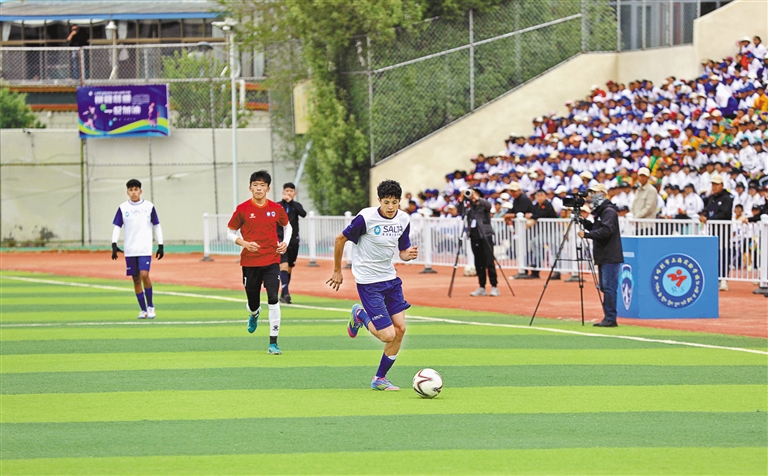 以球為媒,“球”同存“誼”。5月20日下午,中國日喀則市珠峰雪鷹隊與阿根廷薩爾塔普納隊在日喀則市上海實驗學(xué)校體育場上演了一場跨越山海的青少年足球友誼賽。賽場上,雙方球員迅速進入狀態(tài),團結(jié)配合、積極拼搶,用細膩的腳法,或急停、或變向、或假動作,輕松晃過對手,射門得分,給觀眾呈現(xiàn)了一場精彩的足球比賽。