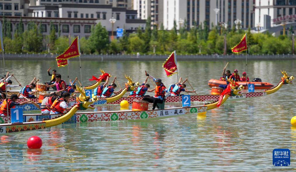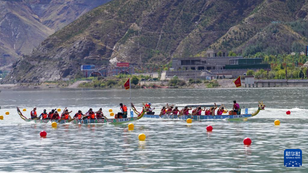 5月31日,參賽隊(duì)伍在龍舟比賽中。新華社記者 晉美多吉 攝