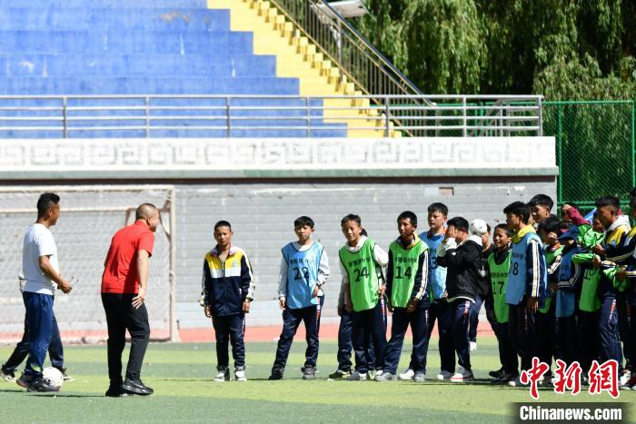 圖為在昌都市察雅縣中學,重慶市第二十九中學校教師黃華(左二)向學生們教授足球技巧。昭信教育研究院 供圖