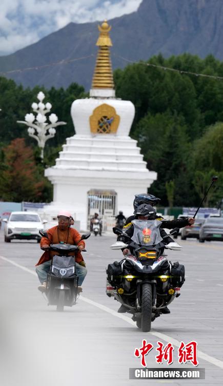 7月3日,摩旅愛好者行駛在拉薩街頭。隨著暑期旅游旺季的到來,進藏自駕游成為旅行愛好者的熱門選擇。房車愛好者、摩旅愛好者選擇自駕抵達拉薩,專程途經(jīng)布達拉宮打卡。中新社記者 李林 攝