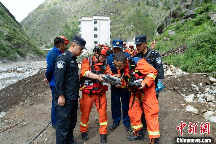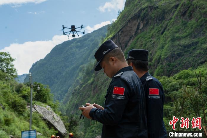 圖為9日,西藏移民管理警察與西藏消防等救援力量,操作無(wú)人機(jī)了解現(xiàn)場(chǎng)情況。肖富貴 攝