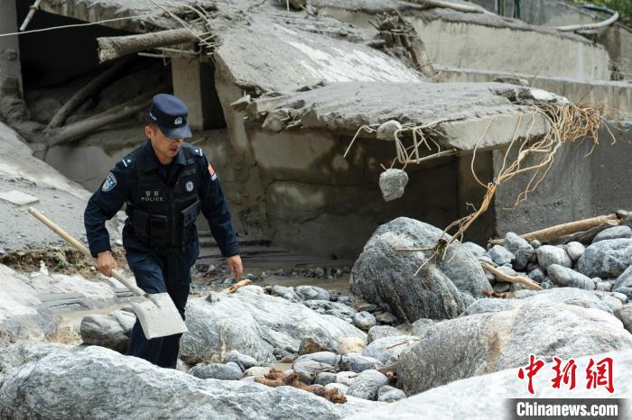 圖為9日,西藏移民管理警察山洪現(xiàn)場(chǎng)排查。肖富貴 攝