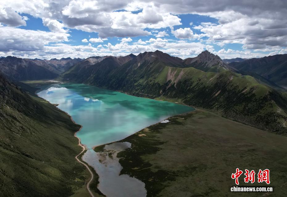 7月21日,嘉乃玉錯(cuò)景色。嘉乃玉錯(cuò)國(guó)家濕地公園位于西藏那曲市嘉黎縣境內(nèi)。夏日,嘉乃玉錯(cuò)碧波蕩漾,湖邊綠意盎然,在藍(lán)天白云映襯下,景色如畫。(無人機(jī)照片)中新社記者 李林 攝