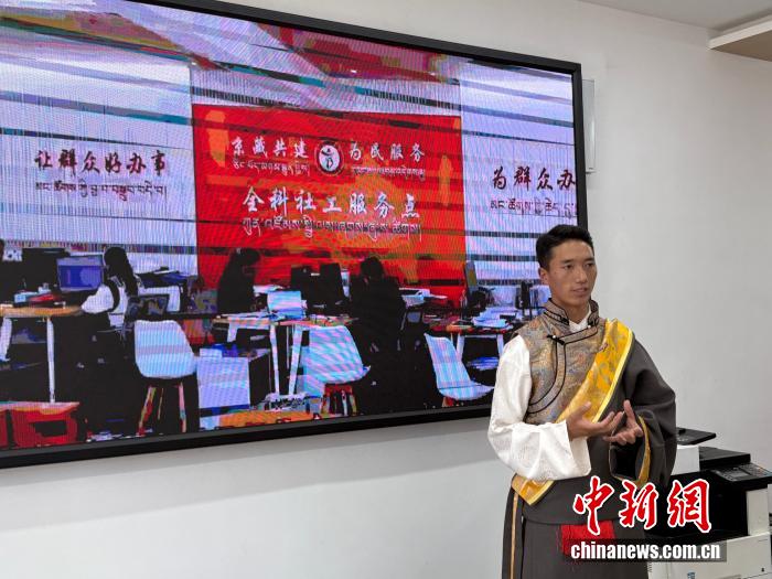 7月24日,拉薩市羊達鄉(xiāng)通嘎社區(qū)工作人員剛組次仁介紹“e”站情況。中新網(wǎng)記者 張東方 攝