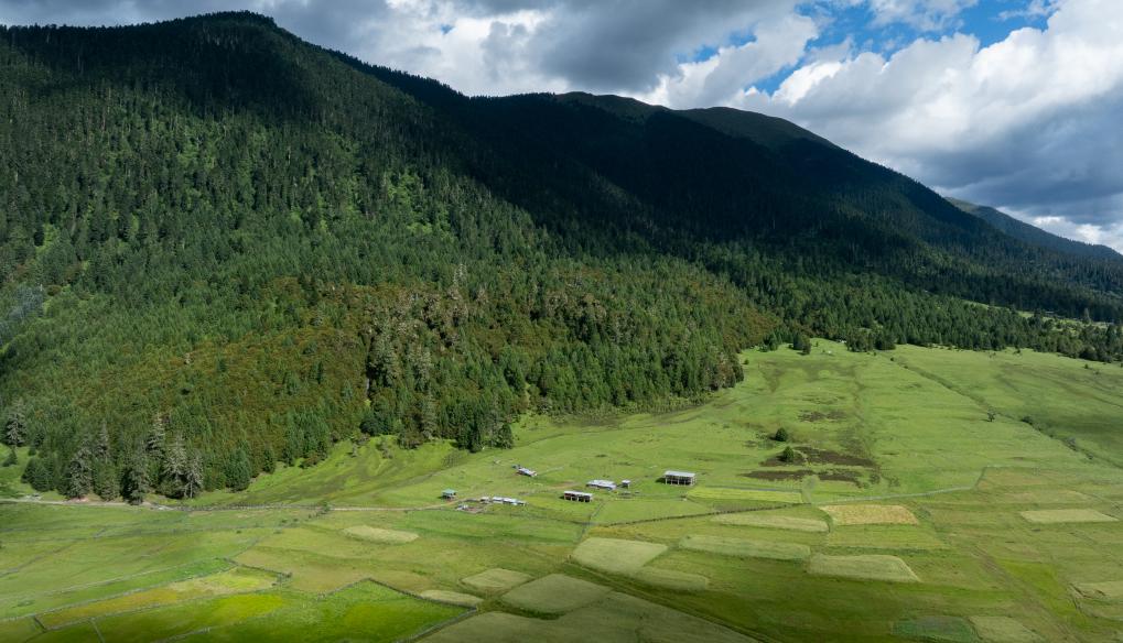 俯瞰扎西崗村旁的花海牧場(無人機(jī)照片)。新華社記者 丁增尼達(dá) 攝