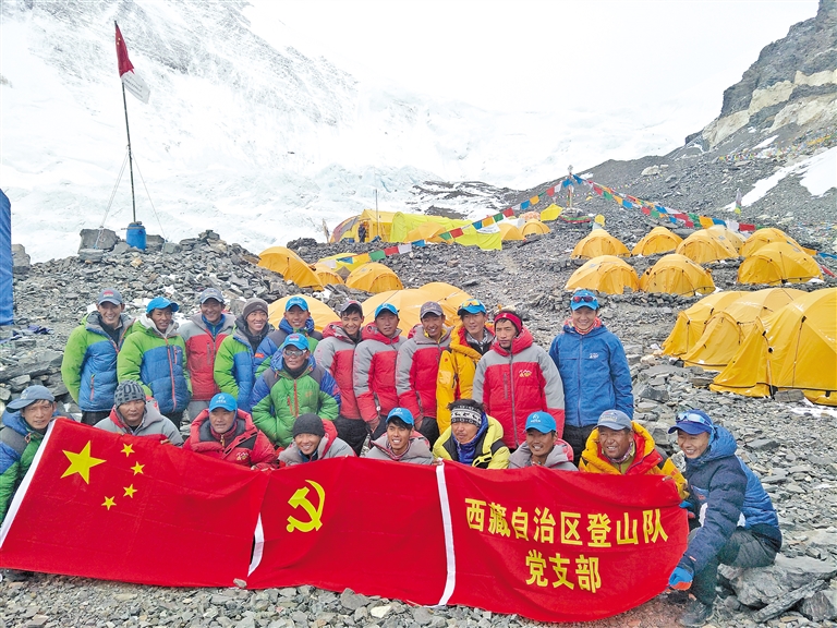 2017年,西藏自治區(qū)登山隊(duì)隊(duì)員在珠峰腳下舉行主題黨日活動。