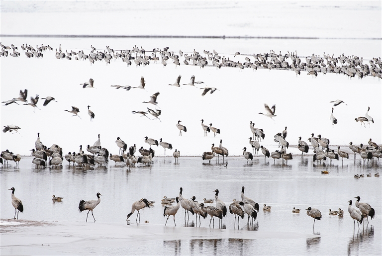 近年來,隨著自駕游客的日益增多,生態(tài)保護也面臨著新的課題。去年,申扎縣專門組建了“雪之傲影”團隊,打造一支專業(yè)生態(tài)保護尖兵,構建“空中無人機巡航+地面智能檢測+隊員徒步巡邏”的全方位防護網絡。同時,每年重點時期開展“保護黑頸鶴家園”主題宣講等,展示展出色林錯國家級自然保護區(qū)內的珍稀野生動物影像資料,向游客宣傳野生動物保護知識。