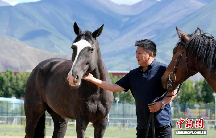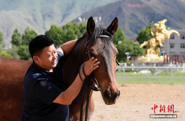 圖為西藏拉薩市北郊賽馬場上,羅輝和馬兒交流感情。李林 攝