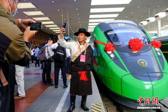 資料圖為2021年6月25日,西藏拉林鐵路開通運(yùn)營,民眾在拉薩火車站與復(fù)興號拍照留念。當(dāng)日,斯朗旺扎系首發(fā)司機(jī)。中新網(wǎng)記者 江飛波 攝