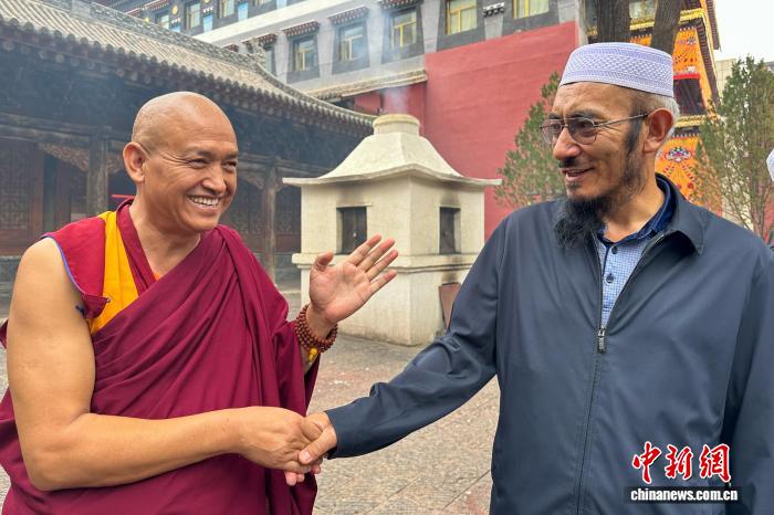 2024年7月,拉薩市政協(xié)副主席、清真大寺教長(zhǎng)亞古(右)到訪青海省宏覺(jué)寺,與藏傳佛教僧人交流。(受訪者供圖)