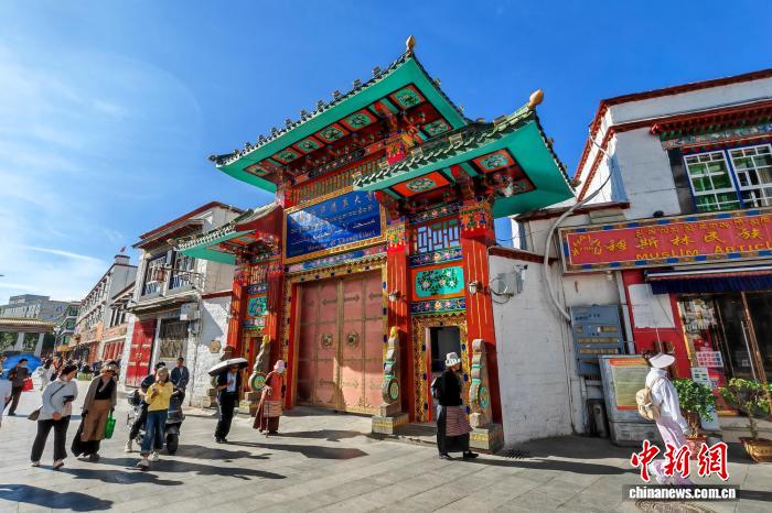 8月1日,藍(lán)天下,拉薩清真大寺的大門(mén)體現(xiàn)出斗拱結(jié)構(gòu)和藏式涂裝風(fēng)格的結(jié)合。中新社記者 江飛波 攝