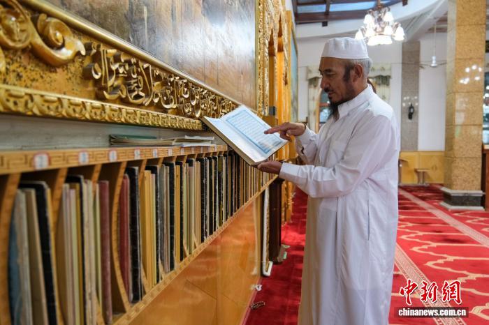 8月1日,拉薩市政協(xié)副主席、清真大寺教長(zhǎng)亞古展示阿拉伯文和藏文對(duì)照的《古蘭經(jīng)選》。中新社記者 江飛波 攝