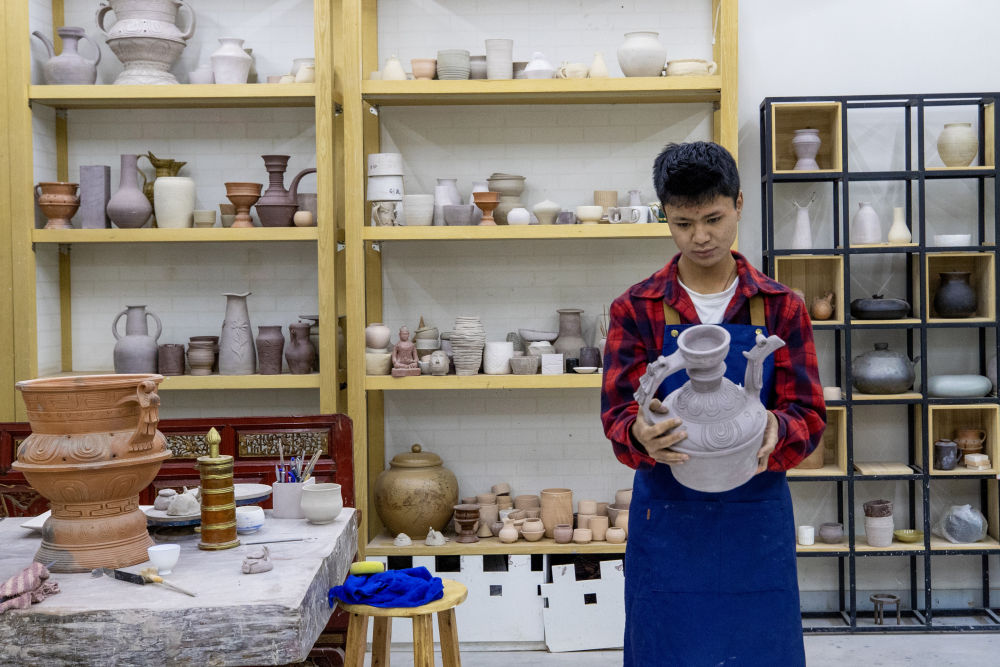 8月6日,一名制陶師在欣賞自己的作品。藏族傳統(tǒng)泥陶雕塑制作技藝入選西藏自治區(qū)級(jí)非物質(zhì)文化遺產(chǎn)代表性項(xiàng)目名錄。
