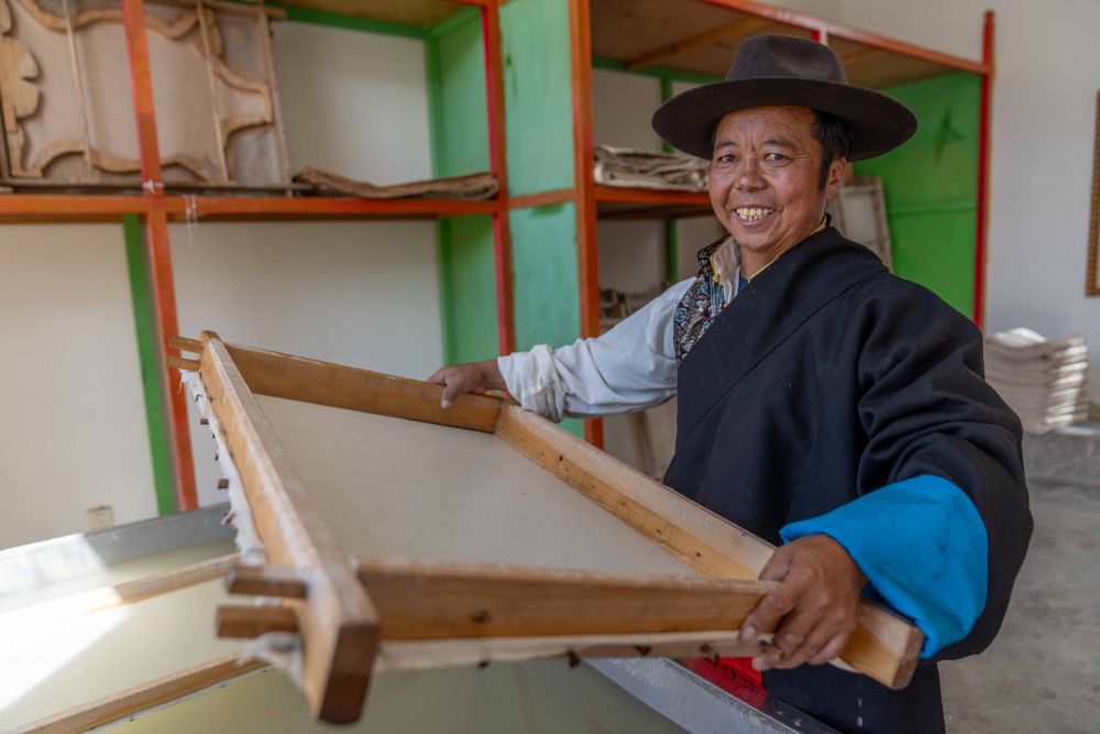 8月12日,雪拉藏紙制作技藝自治區(qū)級(jí)代表性傳承人格桑旦增在制作藏紙。