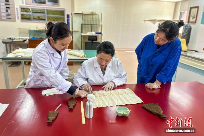 圖為8月14日,退休后的達珍(中)在西藏博物館修復室傳授檔案修復技術(shù)。(受訪者供圖)