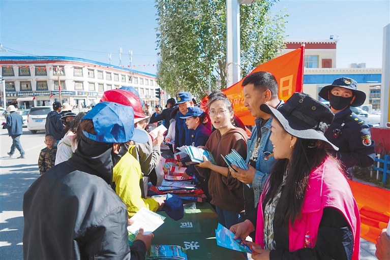 圖為那曲市索縣各普法成員單位工作人員為過(guò)往群眾發(fā)放生態(tài)環(huán)保相關(guān)宣傳資料。本報(bào)通訊員 益西卓嘎 攝