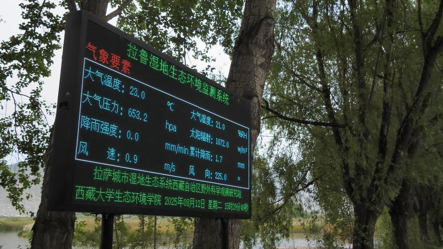 拉魯濕地國家級(jí)自然保護(hù)區(qū)南門內(nèi)的生態(tài)環(huán)境監(jiān)測(cè)系統(tǒng)顯示屏,實(shí)時(shí)顯示濕地內(nèi)的氣象要素、土壤和水環(huán)境、植被指數(shù)等數(shù)據(jù)。新華社記者 黃智琪 攝