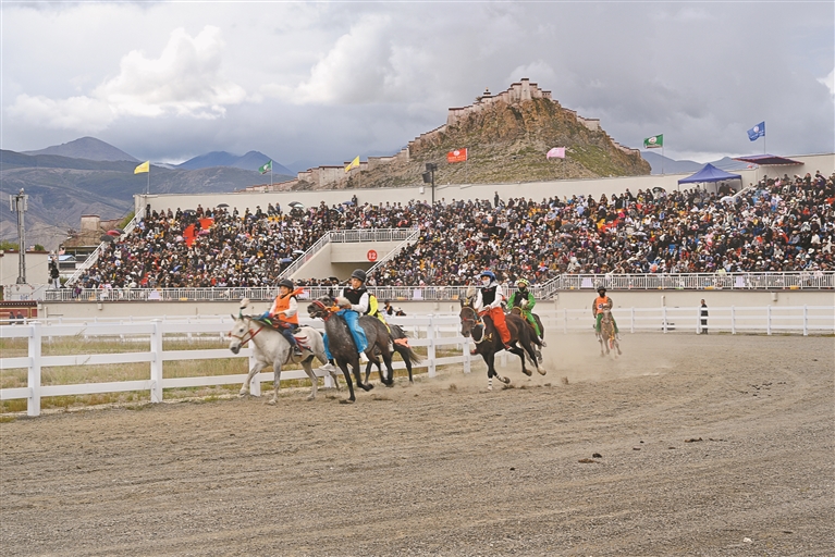 開幕式上,100位騎手策馬奔騰,繞場(chǎng)致意。隨后,擊鼓迎賓、紅色鼓陣、車仁望果、千年名城、英雄江孜、青稞之鄉(xiāng)等10個(gè)方隊(duì)和來自各鄉(xiāng)鎮(zhèn)的賽馬隊(duì)依次入場(chǎng),全方位、多角度展示了江孜縣特色產(chǎn)業(yè)興旺、基礎(chǔ)設(shè)施提升、民生持續(xù)改善的美好圖景,展現(xiàn)了新時(shí)代英雄城兒女堅(jiān)韌不拔、昂揚(yáng)向上的精神風(fēng)貌,深情表達(dá)了江孜人民對(duì)黨的無限感恩、對(duì)祖國的無限熱愛、對(duì)西藏繁榮發(fā)展的美好祝愿。