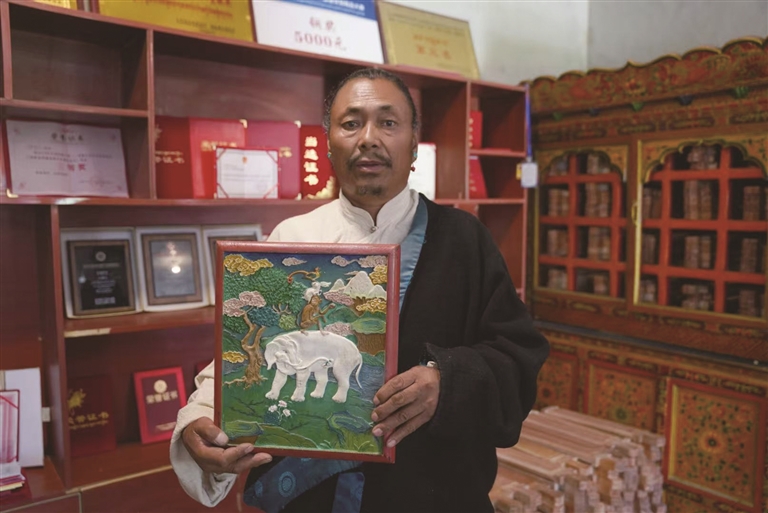 為了進(jìn)一步傳承和發(fā)展普松雕刻技藝,同時(shí)帶動(dòng)鄉(xiāng)親們?cè)鍪罩赂唬?019年,斯曲成立了尼木縣珍寶民族雕刻手工藝農(nóng)牧民專(zhuān)業(yè)合作社。合作社成立之初,只有8名徒弟追隨他,而如今,這支隊(duì)伍已經(jīng)壯大到了12人,并帶動(dòng)村里50余人實(shí)現(xiàn)就近就業(yè),為當(dāng)?shù)氐慕?jīng)濟(jì)發(fā)展注入了新的活力。同時(shí),隨著政府對(duì)傳統(tǒng)手藝的重視程度不斷提高,以及旅游業(yè)的蓬勃發(fā)展,來(lái)當(dāng)?shù)氐挠慰腿找嬖龆唷_@不僅讓普松雕刻這門(mén)技藝被更多人所知曉,也極大地拓寬了合作社的銷(xiāo)售渠道。