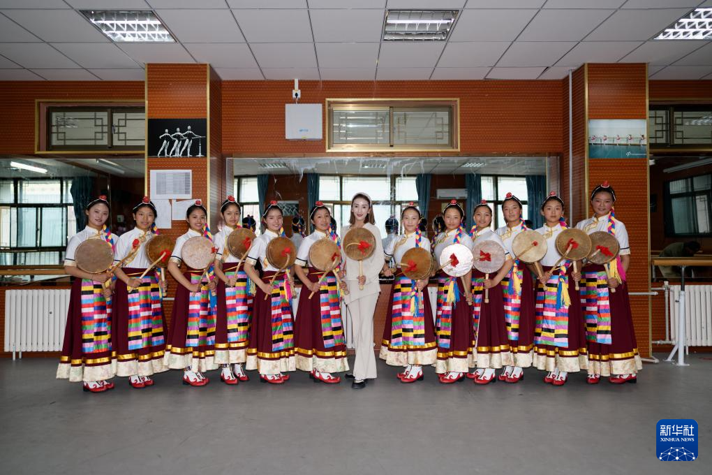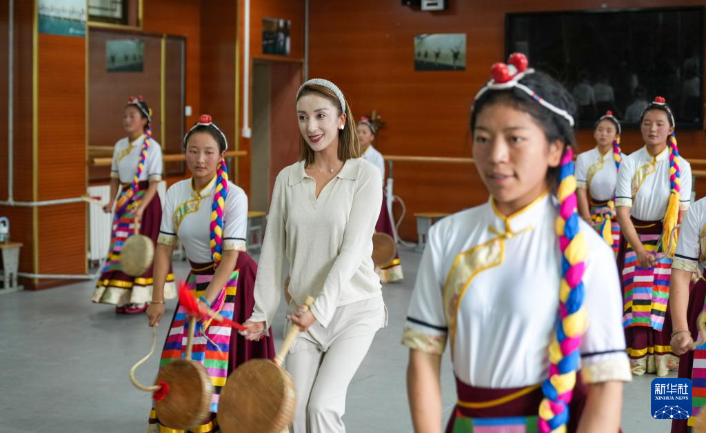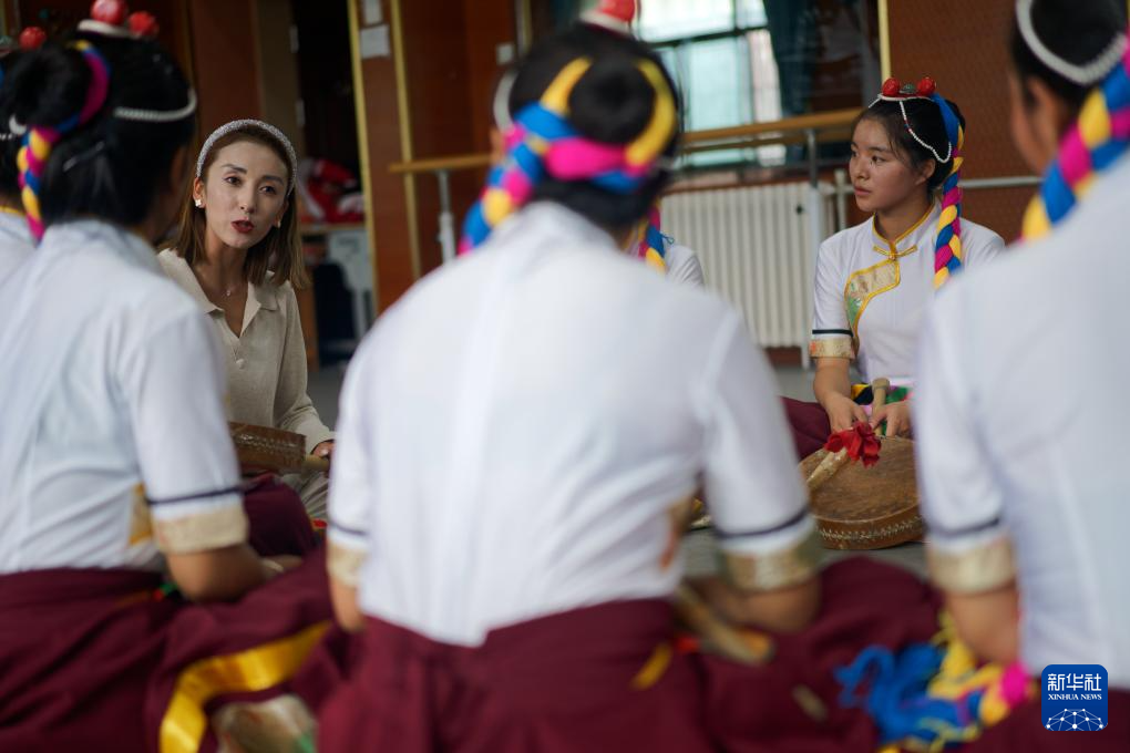 9月9日,在拉薩市第二中等職業(yè)技術(shù)學(xué)校,尼瑪卓瑪老師(右二)指導(dǎo)孩子們舞蹈動作。新華社記者 丁增尼達 攝