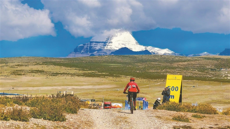 圖為岡仁波齊峰前,選手在奮力騎行。記者 明吉 攝