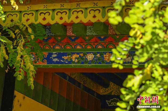 圖為羅布林卡內樹木葉片與藏式建筑相映成景。貢確 攝
