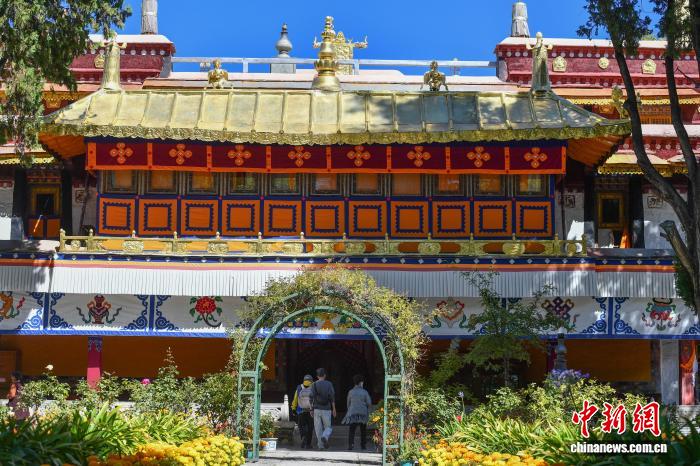 圖為游客在羅布林卡內游覽金色頗章。貢確 攝