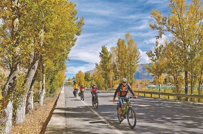 圖為自行車隊(duì)在拉薩市曲水縣秋意盎然的國道騎行。記者 次仁平措 攝