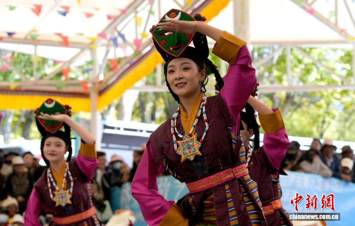 10月19日,“格?;ū崩_市第六屆縣(區(qū))藝術(shù)團(tuán)文藝調(diào)演頒獎活動在布達(dá)拉宮腳下的宗角祿康公園舉行。現(xiàn)場,拉薩市各縣(區(qū))藝術(shù)團(tuán)帶來精彩節(jié)目。圖為文藝調(diào)演頒獎活動上的文藝表演。中新社記者 李林 攝