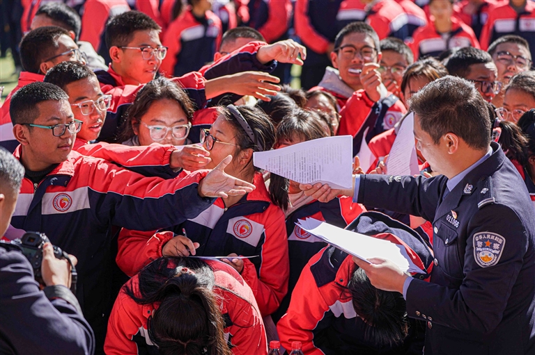 西藏“開學(xué)第一課”網(wǎng)絡(luò)普法進(jìn)校園活動(dòng)中,民警為學(xué)生發(fā)放普法宣傳知識手冊。記者 貢曲羅杰 攝