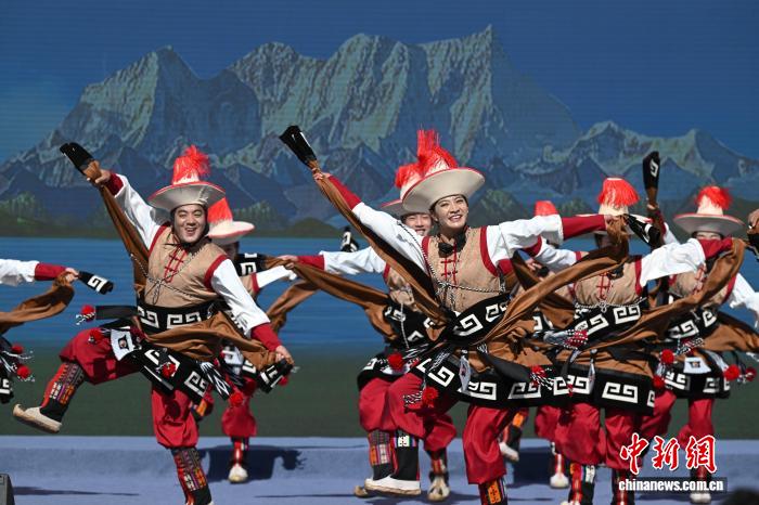 圖為阿里地區(qū)改則縣藝術(shù)團(tuán)表演舞蹈《歡舞幸?!じ膭t情》。中新社記者 貢嘎來(lái)松 攝