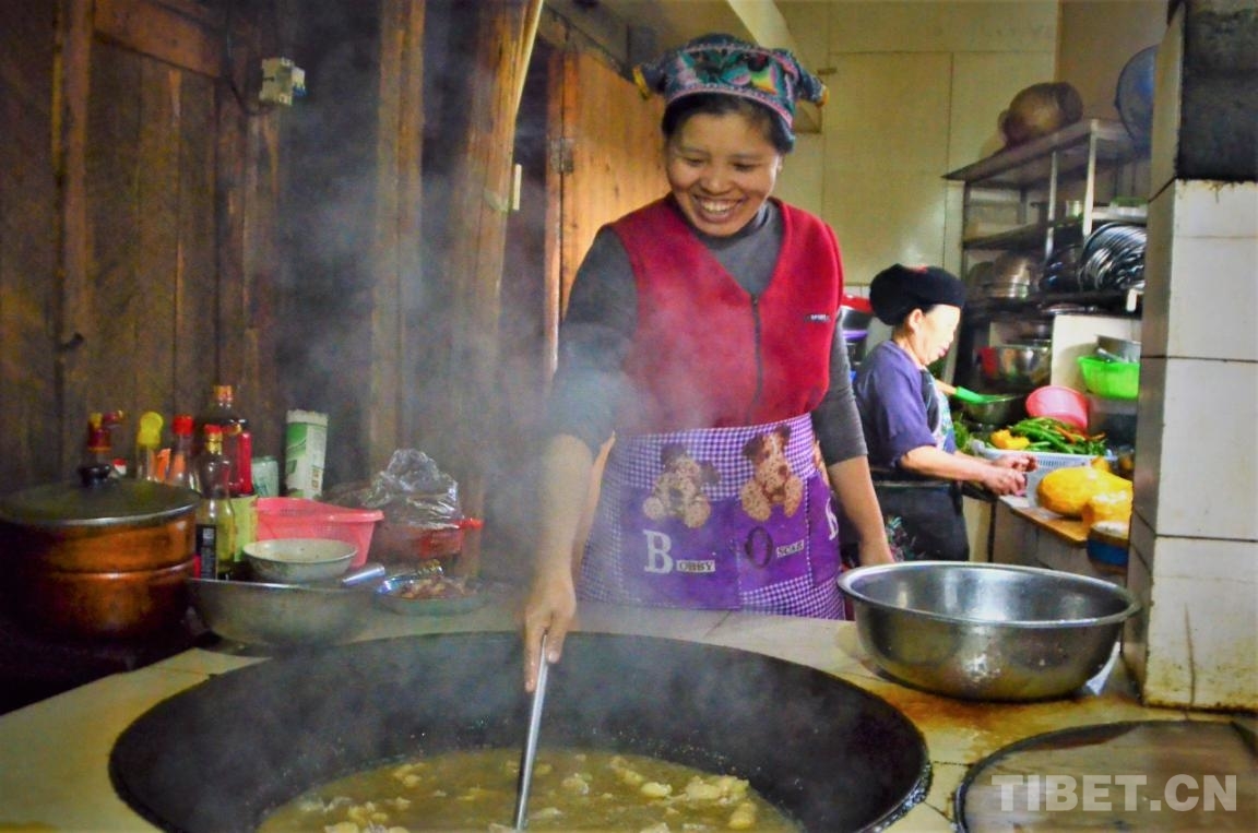 中國(guó)西藏網(wǎng)訊 上午十點(diǎn)多,差不多到了楊珍壽一天之中最忙碌的時(shí)候。她有條不紊地翻炒著大鐵鍋里的雞肉,母親在她身后切著菜,父親在劈著柴火。再過(guò)一個(gè)小時(shí)左右,自家的農(nóng)家樂(lè)就要開(kāi)飯了。每到周末,更多游客會(huì)來(lái)到這里,忙碌翻倍,收入也會(huì)翻倍。