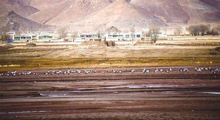 虎頭山水庫里鶴群正在河邊梳理羽毛,姿態(tài)十分優(yōu)雅。不一會兒,開始成群飛走,我們跟隨鶴群來到了附近村莊,蹁躚的鶴群,蒼黃的野草,清澈的湖泊,壯美的日出,散漫的牛羊,獨(dú)特的藏式民居,裊裊的炊煙……當(dāng)下,林周縣黑頸鶴國家級自然保護(hù)區(qū)進(jìn)入了觀鶴拍鶴的最佳時節(jié)。