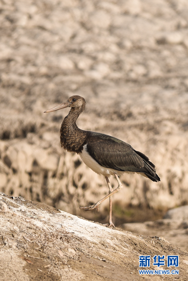 12月6日,一只黑鸛在西寧市北川河濕地公園內(nèi)行走。新華社記者 吳剛 攝
