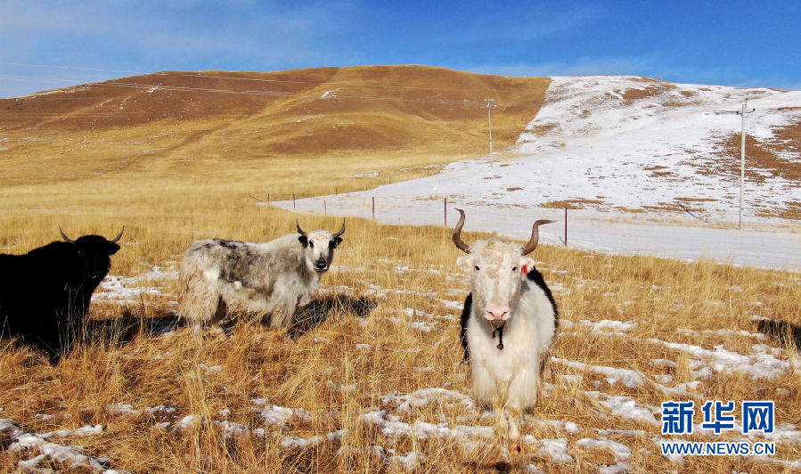 在青海省祁連縣,幾頭牦牛在雪后的草原上活動(dòng)(12月7日攝)。新華社記者 張宏祥 攝