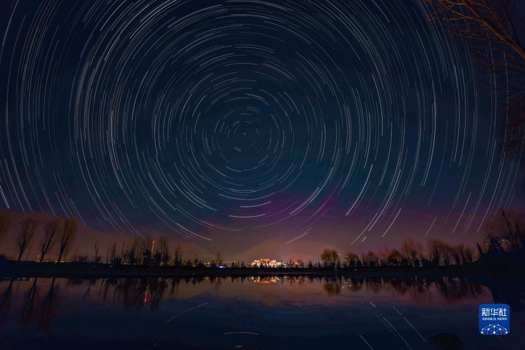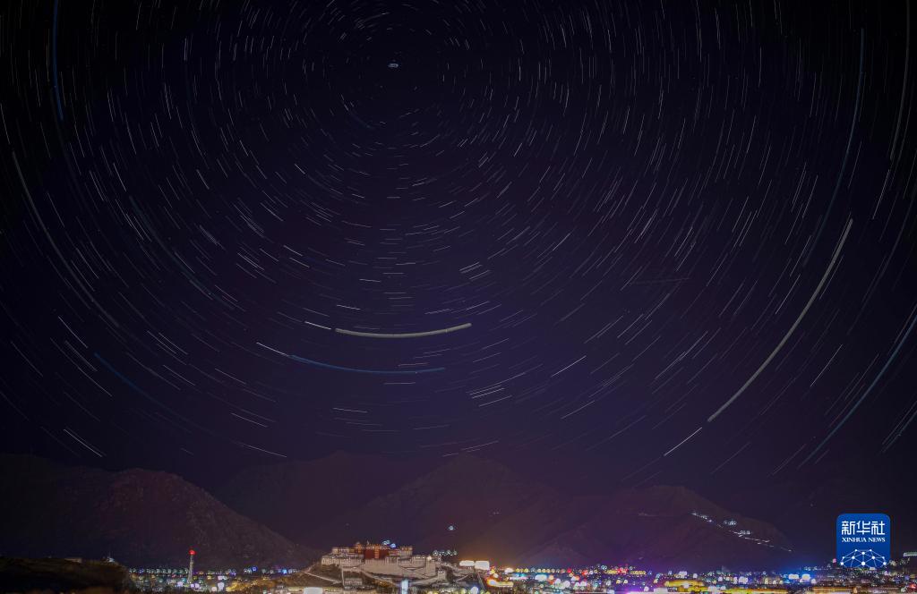 這是在拉薩市南山公園拍攝的以布達(dá)拉宮為前景的星軌照片(合成照片,11月21日攝)。新華社記者 姜帆 攝