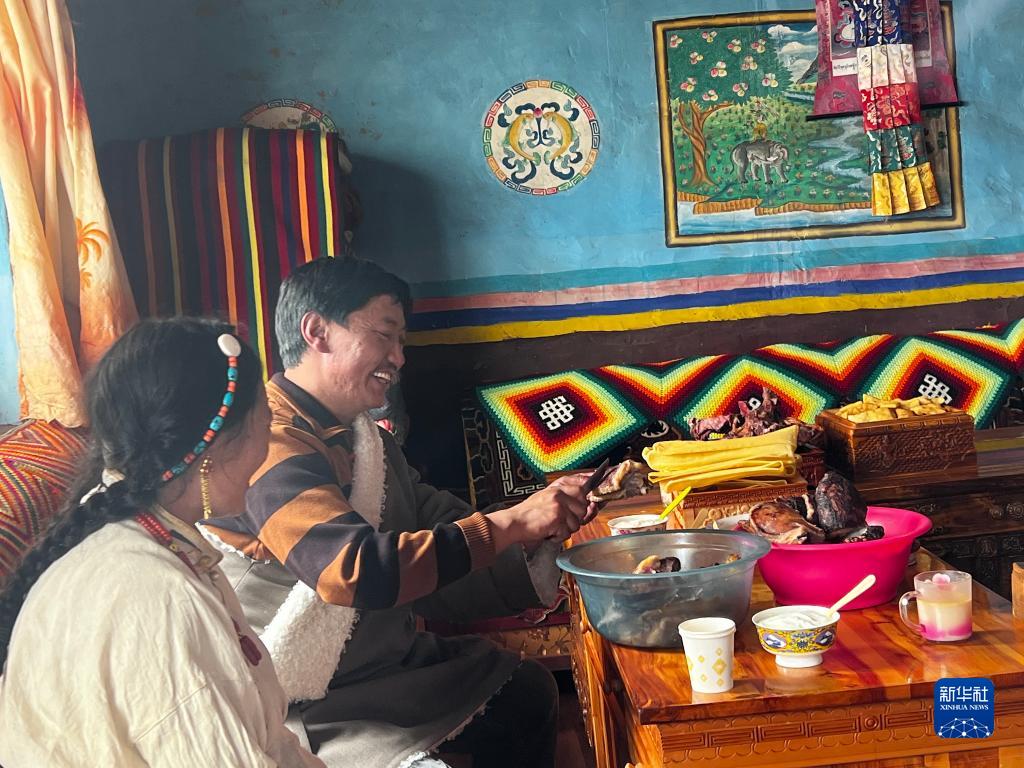 增措的丈夫娃布正在切肉(2023年3月8日攝)。新華社記者格桑邊覺(jué) 攝