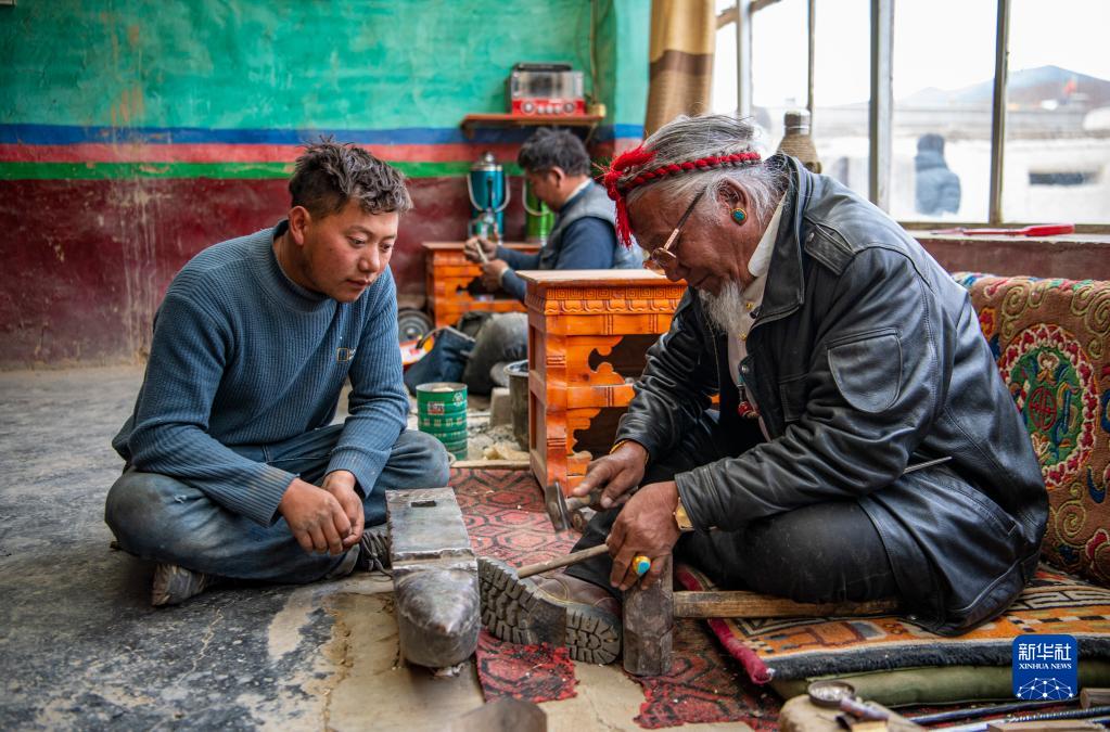 在拉孜縣柳鄉(xiāng)孜龍村,次旦旺加(右)在指導孫子制作藏刀(3月17日攝)。新華社記者 孫非 攝