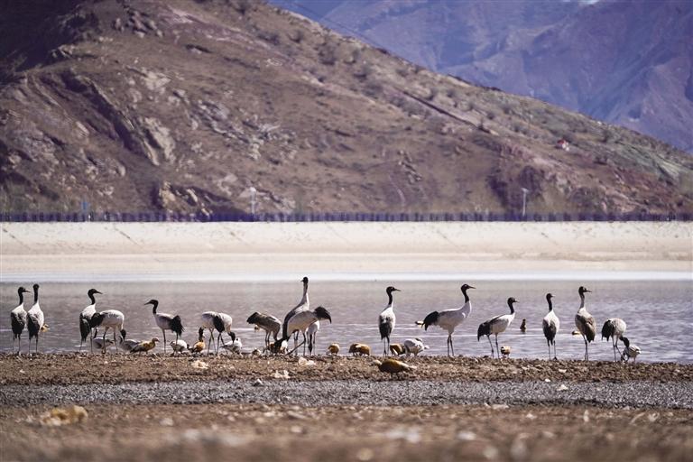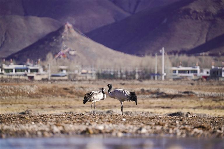黑頸鶴是國家一級保護(hù)動物,在藏語中稱為“沖沖”。主要棲息在海拔2500米至5000米的高原、草甸、沼澤地帶。拉薩北部的林周縣平均海拔約4200米,是黑頸鶴的主要越冬地之一。最近這段時間,對拉薩市林周縣野保員們來說,一邊要忙自家的農(nóng)活,一邊還要巡查候鳥情況?!耙呀?jīng)有一小部分飛走了,估計再過半個月都會陸續(xù)飛走。”3月23日上午,野保員旦增告訴記者,在虎頭山水庫和卡孜水庫越冬的候鳥有一部分已經(jīng)飛走了。野保員口中的“飛走”便是遷徙,遷徙是候鳥的本能,一年一年,跟隨時間的召喚,完成兩次遷徙:繁殖和越冬。