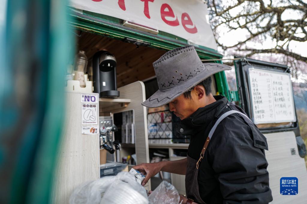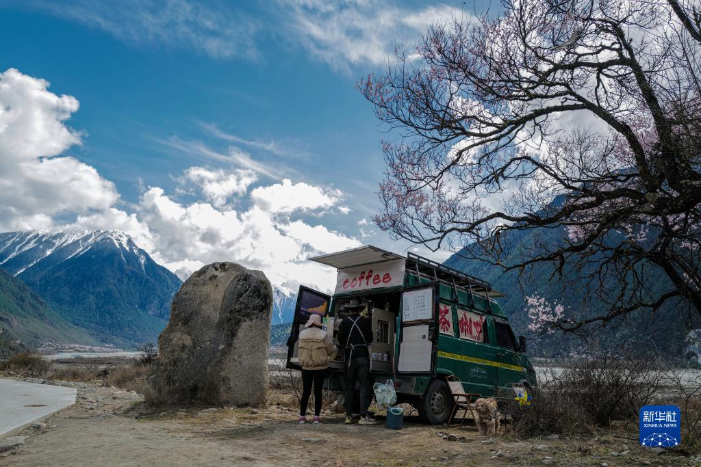 牟宜平和譚艷的咖啡車(chē)停在桃花谷中(2023年3月24日攝)。新華社記者 洛卓嘉措 攝